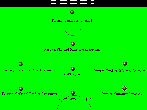 Senior Partner & Prime The Senior Partner acts as the single point of responsibility to the customer and the executive leader of the team. Formulates the scope of work and completion strategy ensuring each individual partner is supported throughout the assignment. Partner, Customer Advocacy Prime for the end customer relationship - assessing their needs and requirements against the product or service on offer. This unique approach allows the team to focus immediately on the needs of the end customer, by bringing their demands within the enterprise rather than the traditional methods of assessing them as an external phenomena. This partner will likely be a senior sales executive with the proven capability to build effective sales teams and develop distribution networks. Partner, Market and Product Assessment This partner will quickly understand the market that is to be targeted by the enterprise and then determine what discontinuities will lead to improved value proposition and greater competitive advantage. This partner will be responsible for Product Management, Product Marketing and Product Introduction. Chief Engineer This